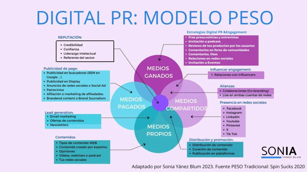 El Modelo PESO fue creado por Gini Dietrich, fundadora y especialista en relaciones públicas de la agencia Spin Sucks. Este modelo se relaciona estrechamente con las relaciones públicas digitales (Digital PR) ya que proporciona un marco integral para planificar y ejecutar campañas de comunicación efectivas en el entorno online.